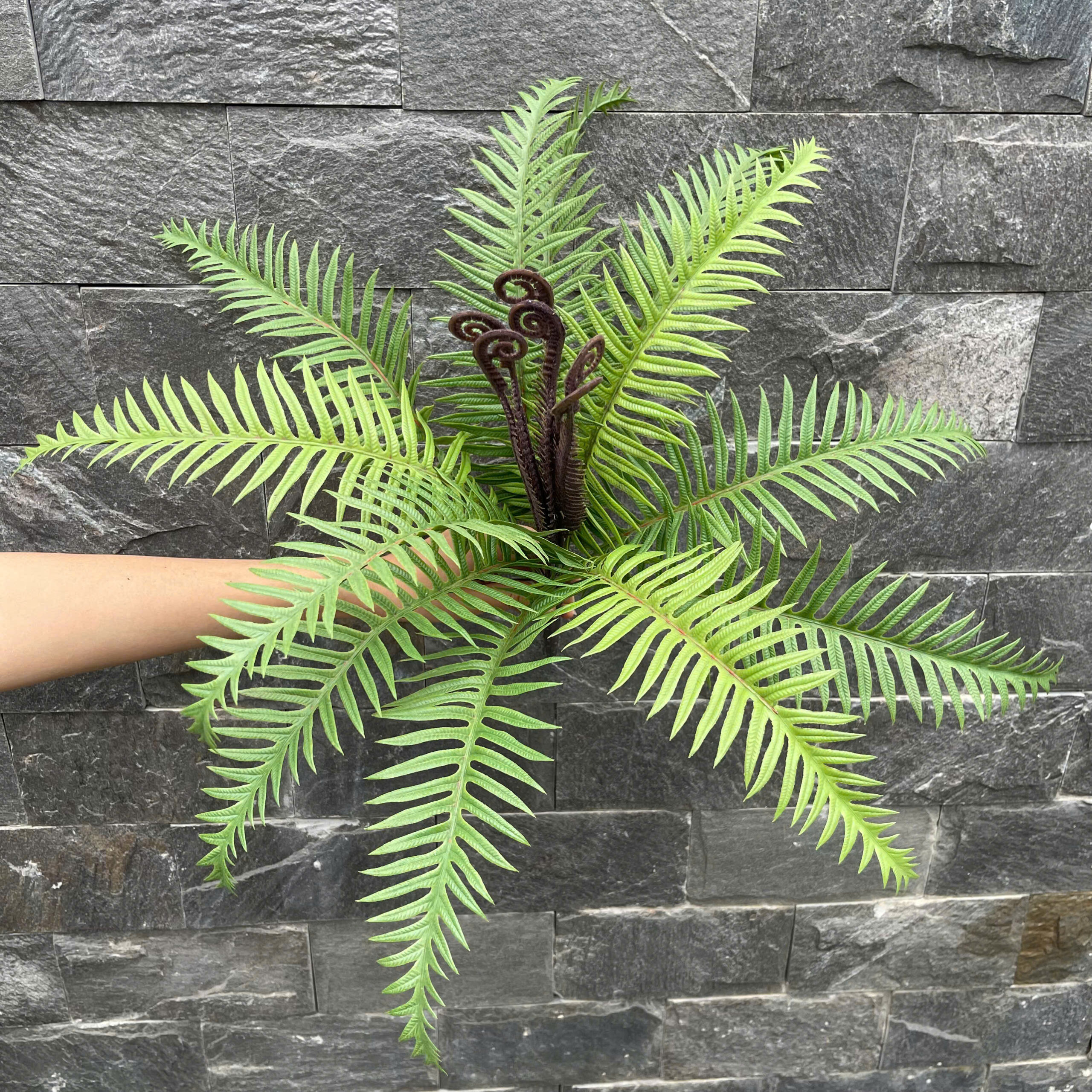 Cây dương xỉ có cuống thép bọc nhựa PVC Cành lá nhân tạo thường được dùng để làm những bức tường cây giả trang trí Tường cây, vườn đứng là phương pháp trồng cây nghệ thuật trên tường là kiểu kiến trúc xanh độc đáo với phong cách mang thiên nhiên gần với con người. Vườn đứng có thể trông ở trong không gian nhà bạn mà không mất diện tích, từ sân vườn, ban công, hiên sảnh, mái nhà, mảng tường.v.v. đều có thể trở thành những bức tường xanh mát,